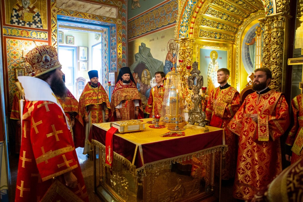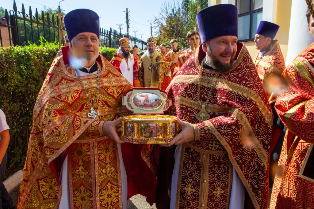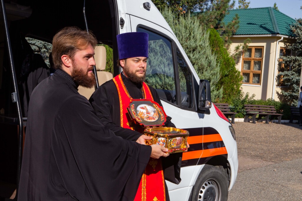 Накануне из Астрахани был доставлен ковчег с частицей мощей святого великомученика Георгия Победоносца в сопровождении делегации во главе с представителем Всемирного русского народного собора Денисом Панько.