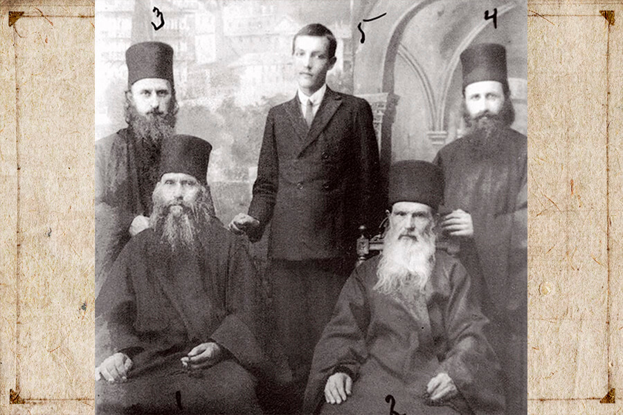 Старец Силуан Афонский (под цифрой 1 на фото) с будущим архимандритом Софронием (под цифрой 3 на фото)
