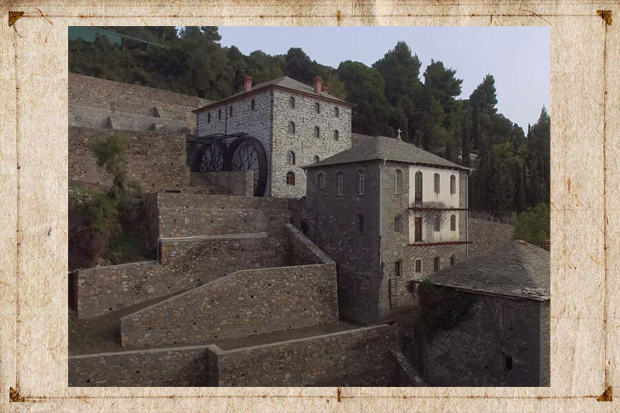 Многие сотни паломников постоянно прибывали из России и подолгу жили в монастырских гостиницах. Работы у послушников было много. Первым трудовым послушанием Симеона стала работа на мельнице.
