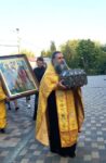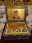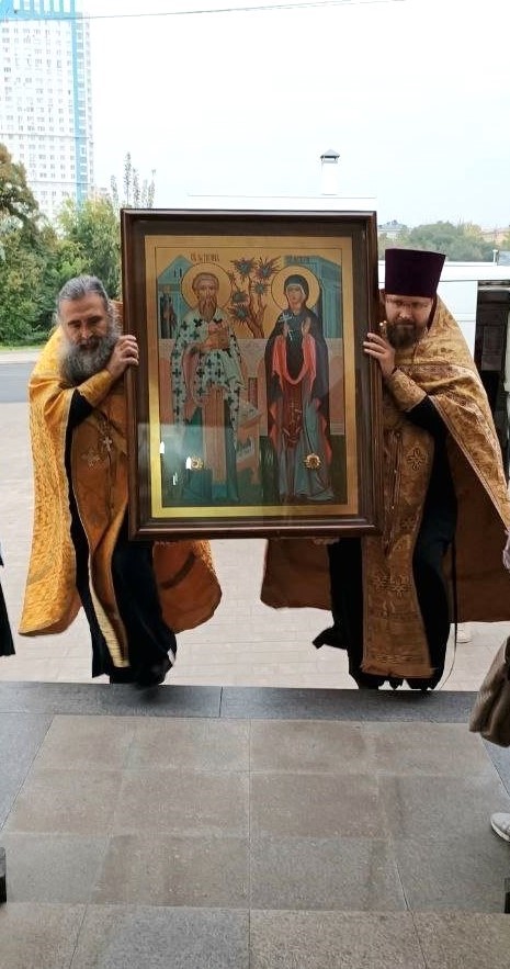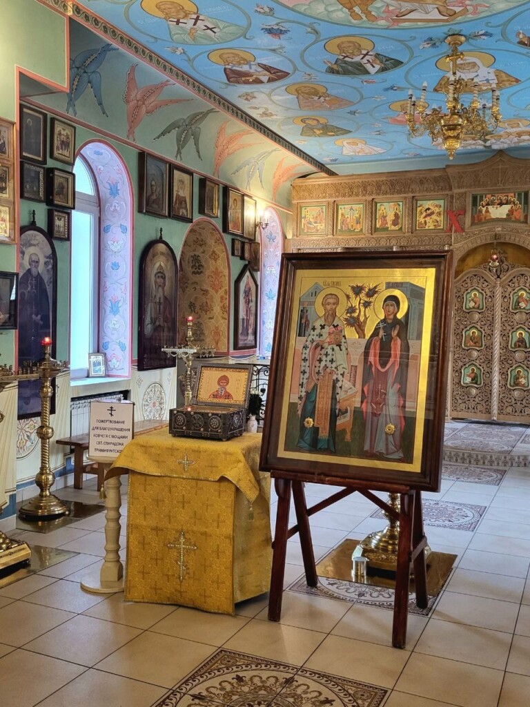 Верующие Александровского благочиния встретили святыни из Ташкентской и Узбекистанской епархии — икону священномученика Киприана и мученицы Иустины с частицами их святых мощей и ковчежец-стопу с частицей мощей святителя Спиридона Тримифунского.