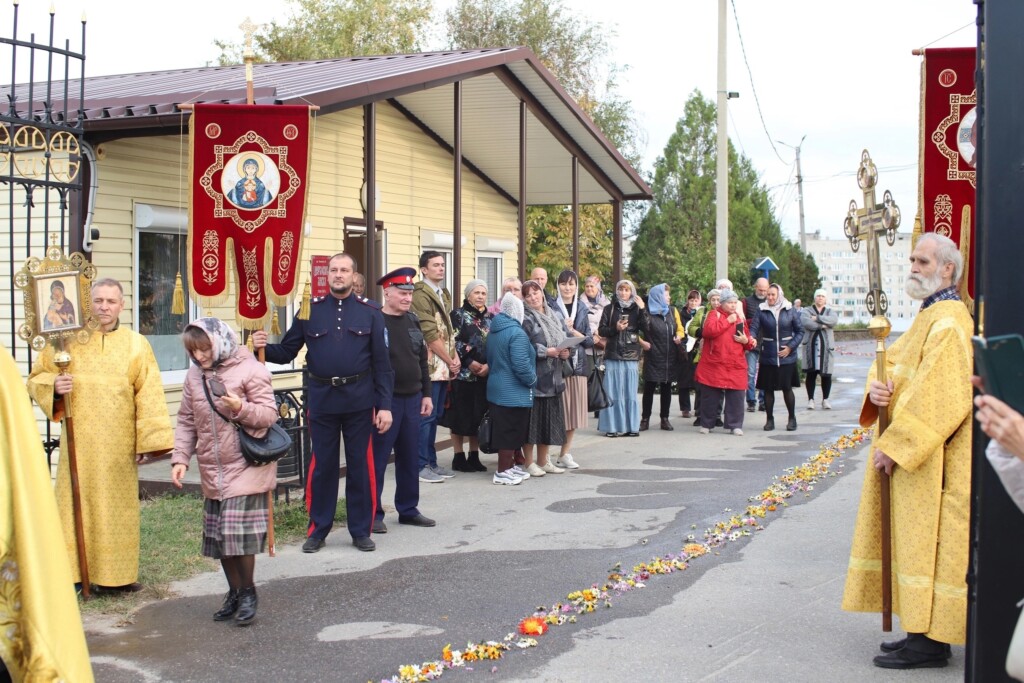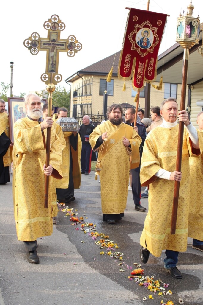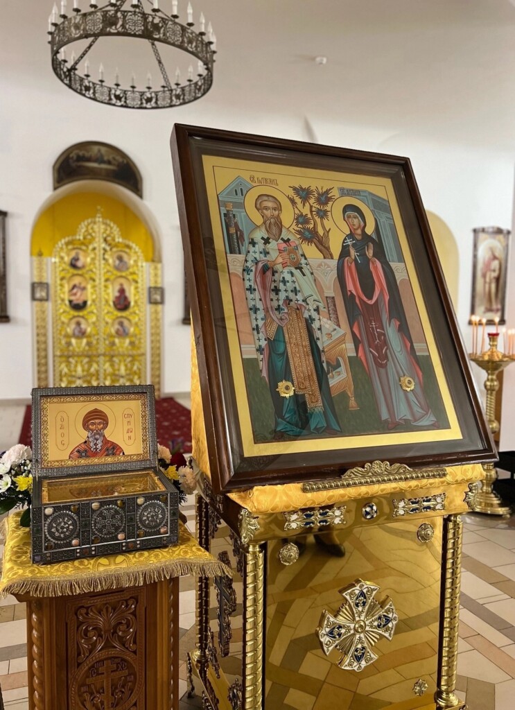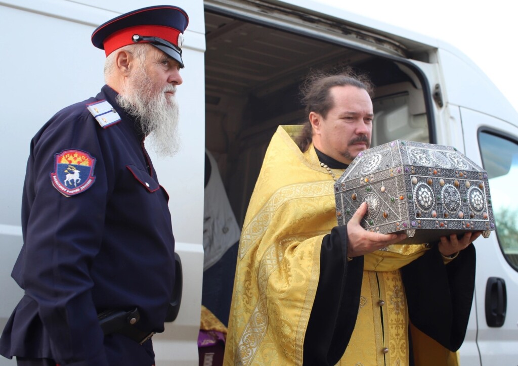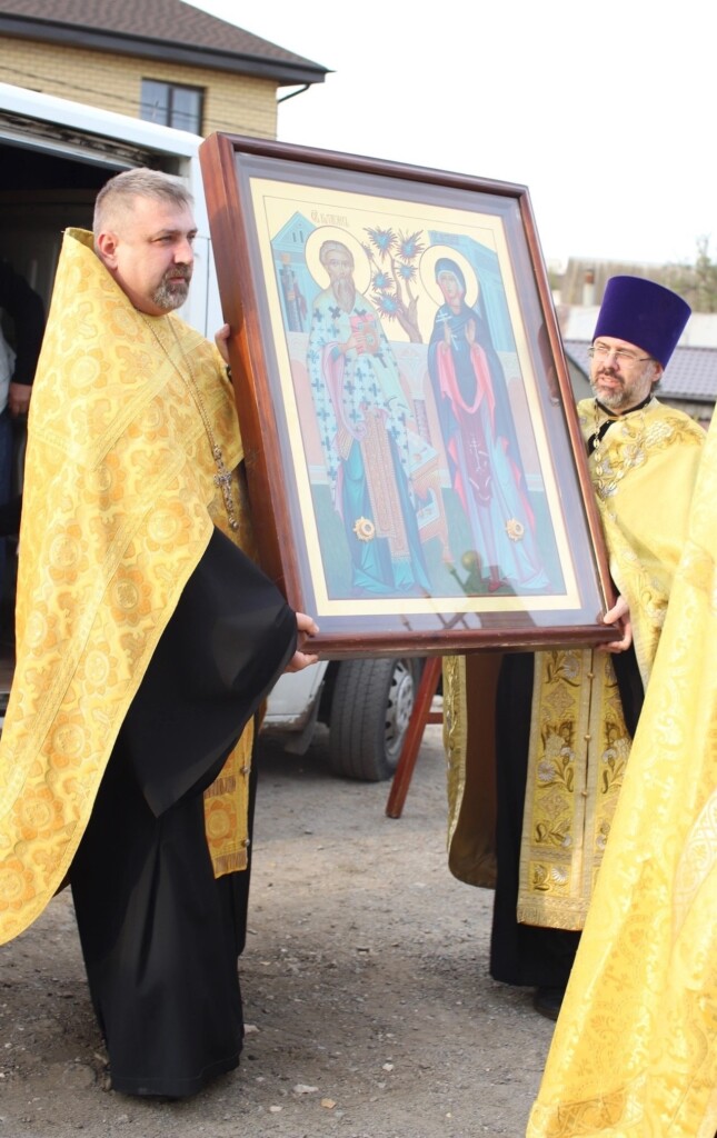Духовенство Сталинградского благочиния и верующие встретили икону священномученика Киприана и мученицы Иустины с частицами их святых мощей и ковчежец-стопу с частицей мощей святителя Спиридона Тримифунтского.