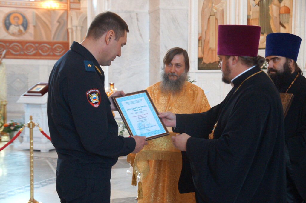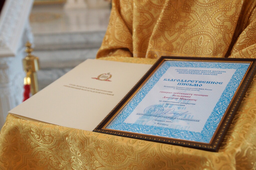 Протоиерей Димитрий Кочергин вручил благодарственное письмо митрополита Волгоградского и Камышинского Феодора. Также передан поздравительный адрес генерал-лейтенанту полиции Вельможко Дмитрию Юрьевичу, начальнику Главного управления МВД России по Волгоградской области, с Днем сотрудника органов внутренних дел Российской Федерации и присвоением специального звания генерал-лейтенант полиции.