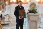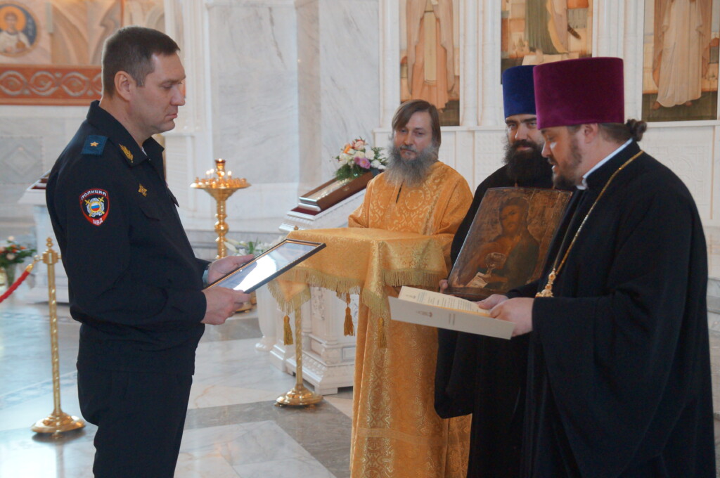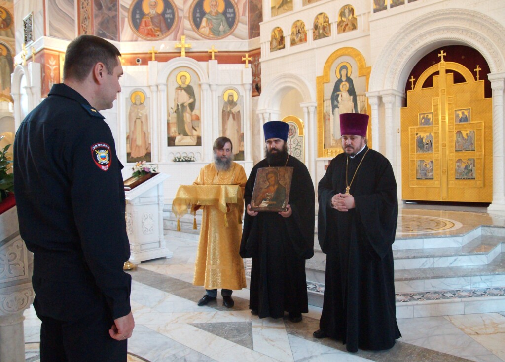 Заместитель начальника ГУ МВД России по Волгоградской области — начальник полиции, генерал-майор полиции Павел Викторович Михайлов и начальник городского УМВД полковник полиции Максим Тимофеевич Полухин торжественно передали святыню духовенству.