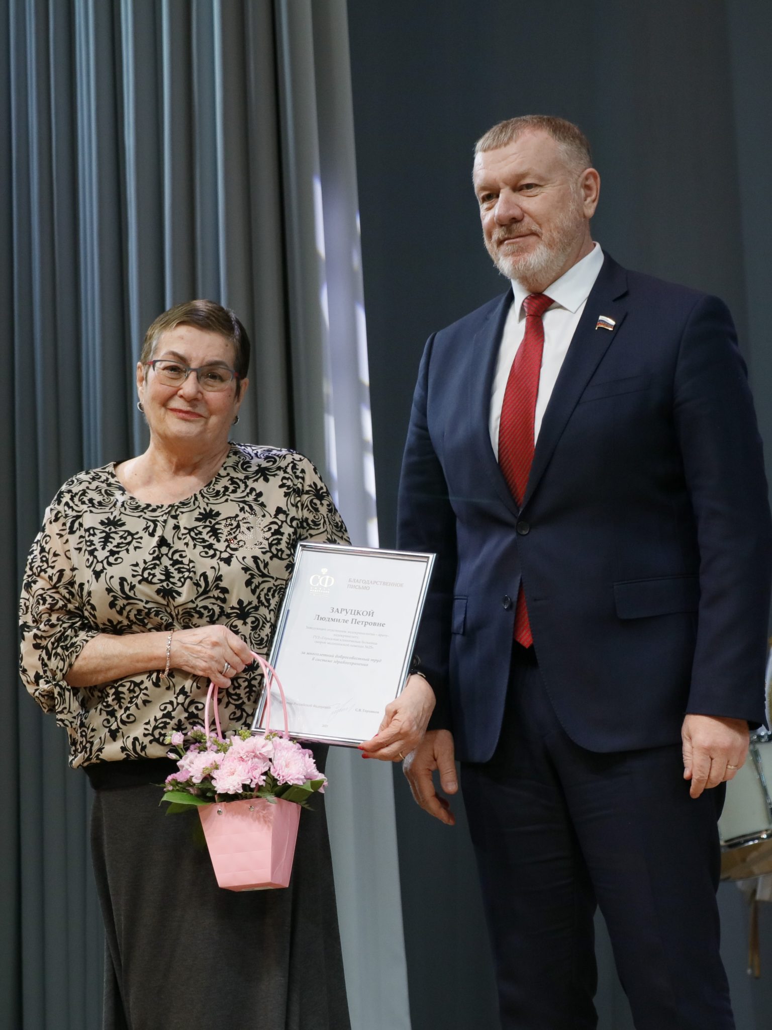 В ходе церемонии председатель комитета Волгоградской областной Думы по охране здоровья, Заслуженный врач РФ Наталья Семёнова и заместитель руководителя профильного комитета, ректор ВолгГМУ Владимир Шкарин от имени региональных парламентариев поздравили коллектив 25-й больницы с юбилеем и передали главному врачу Марине Королёвой приветственный адрес председателя облдумы Александра Блошкина.