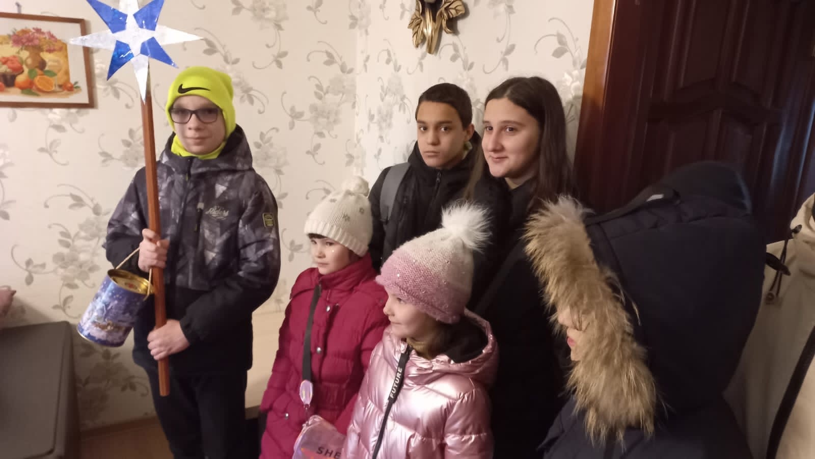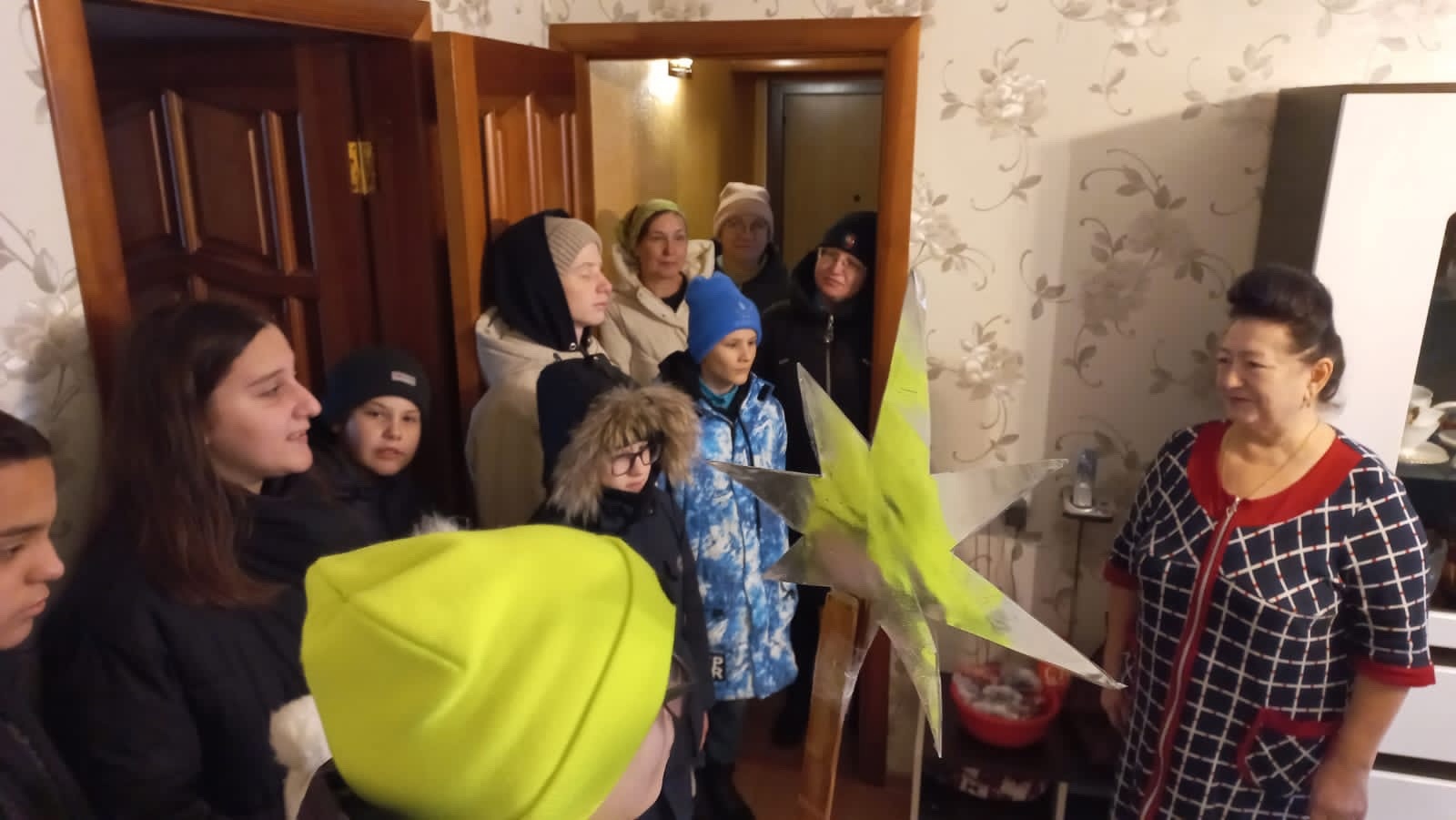 Затем с Вифлеемской звездой ребята пошли славить Богомладенца Христа и Его Пресвятую Матерь в ближайшие к храму дома и к болящим прихожанам. Христославов везде встречали с радостью, вместе с ними пели Рождественские колядки.