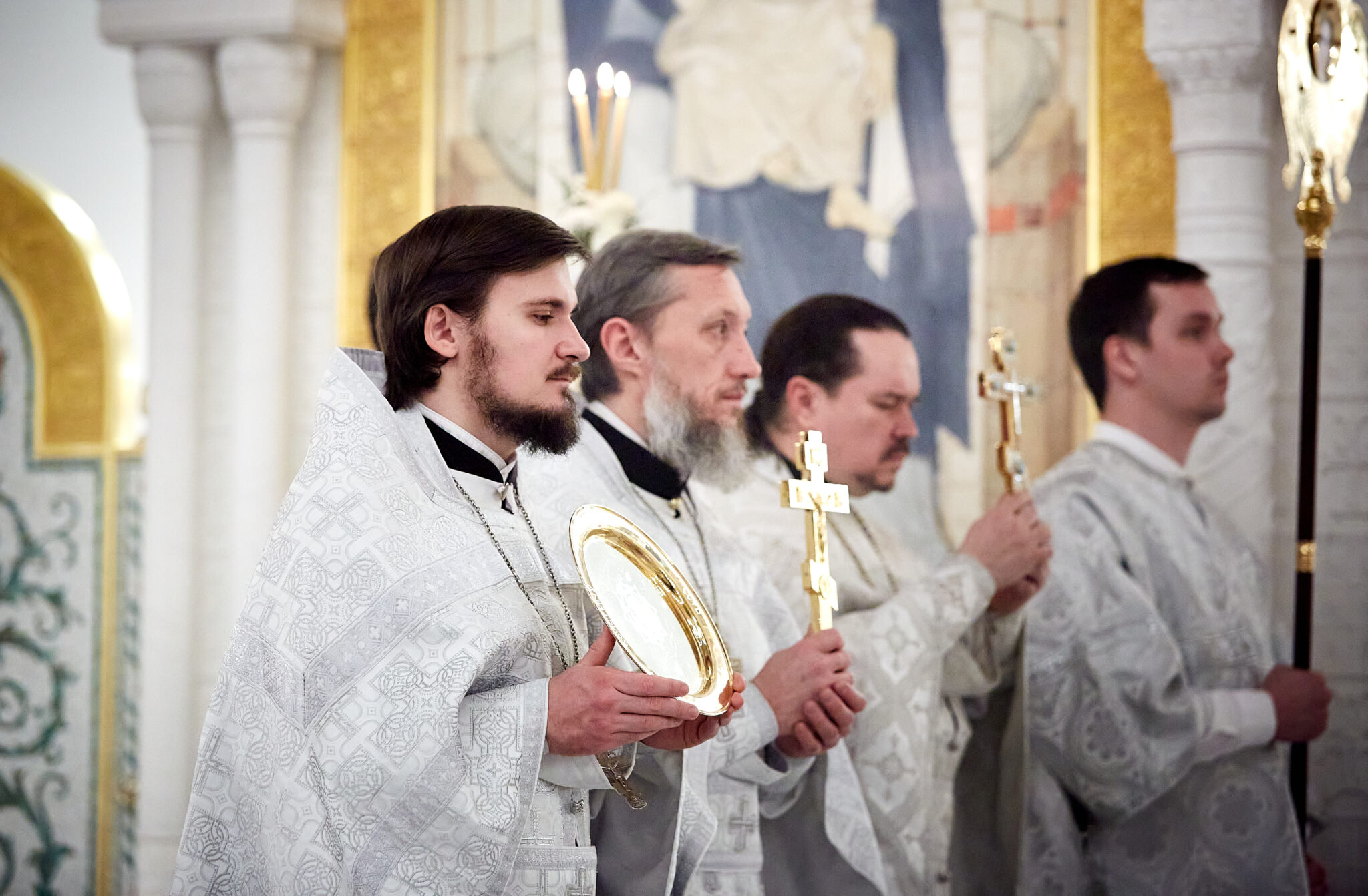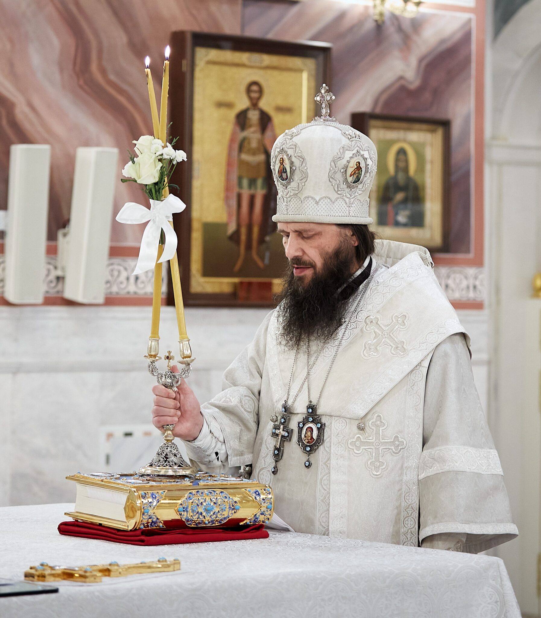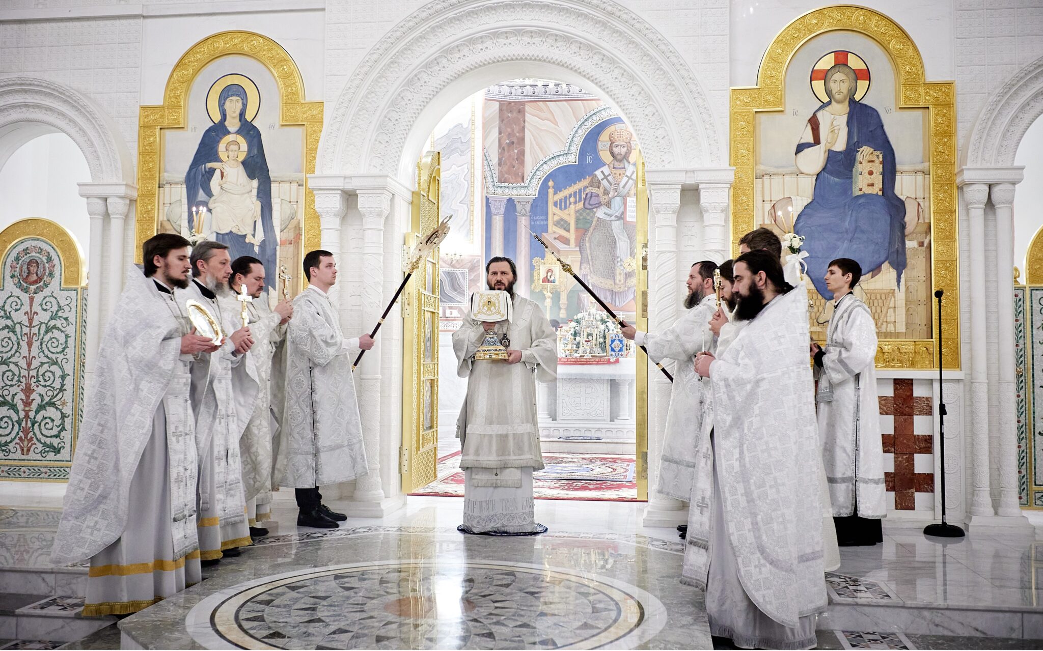 Затем правящий архиерей благословил воду крестообразно честным крестом, при каждом погружении креста в воду велигласно исполняя тропарь «Во Иордане крещающуся Тебе, Господи…».