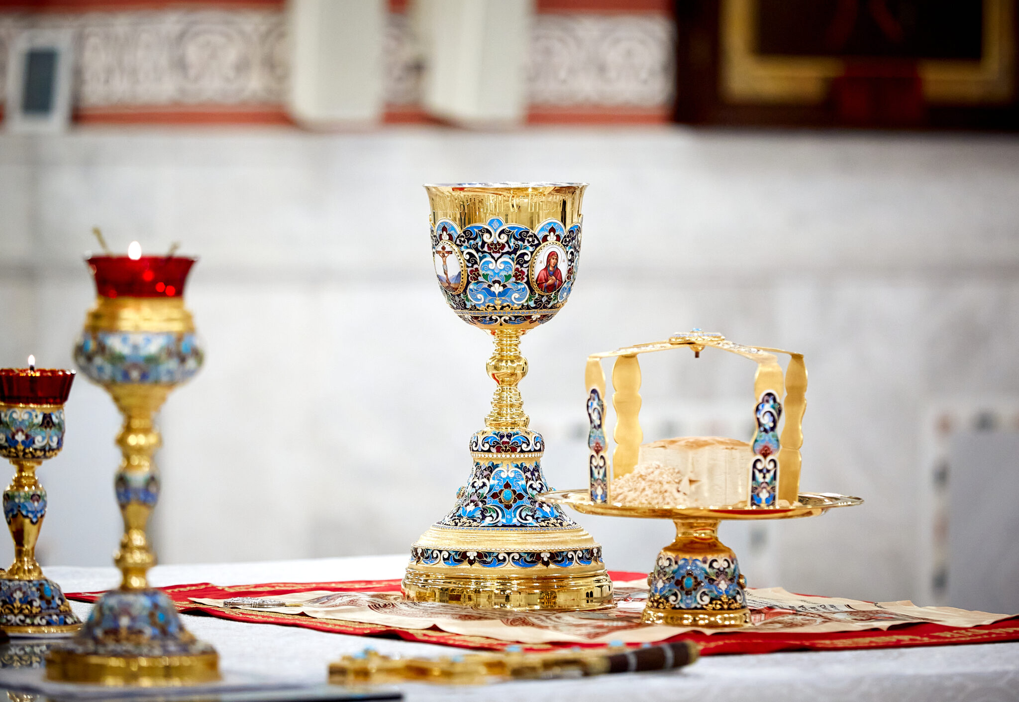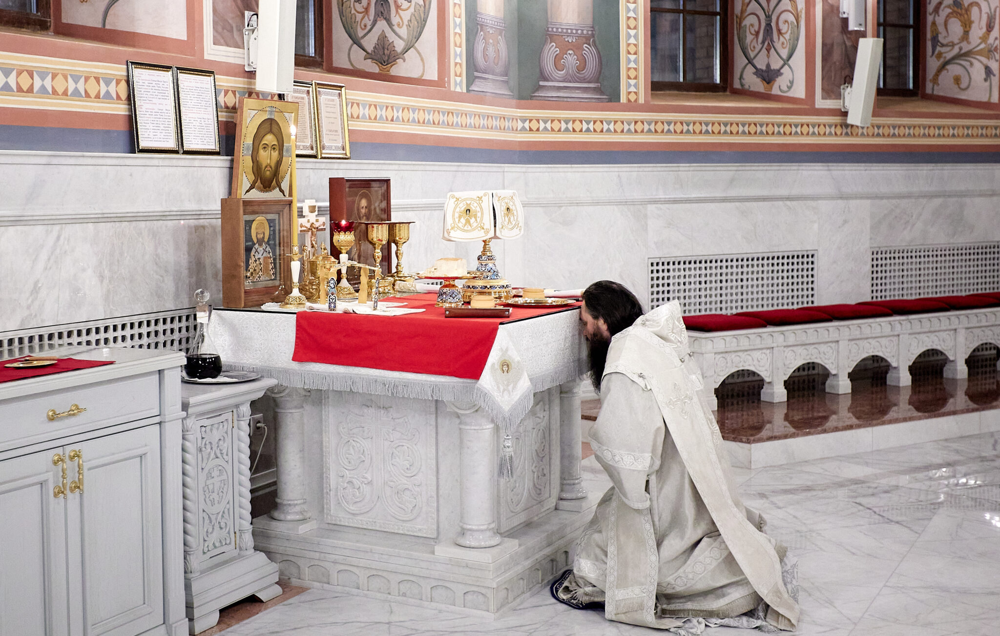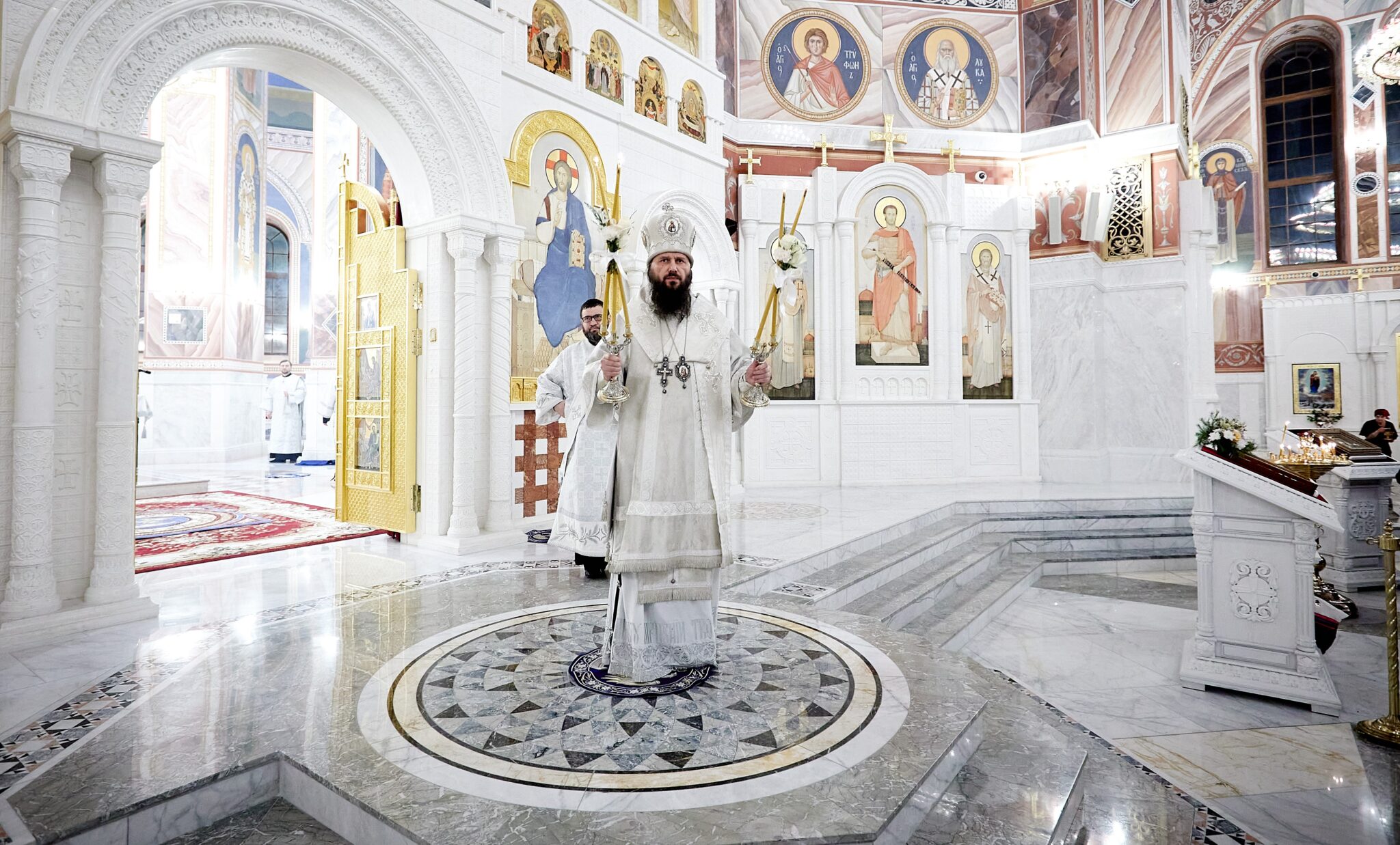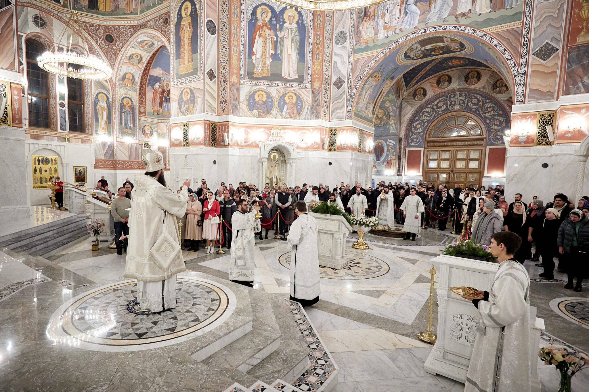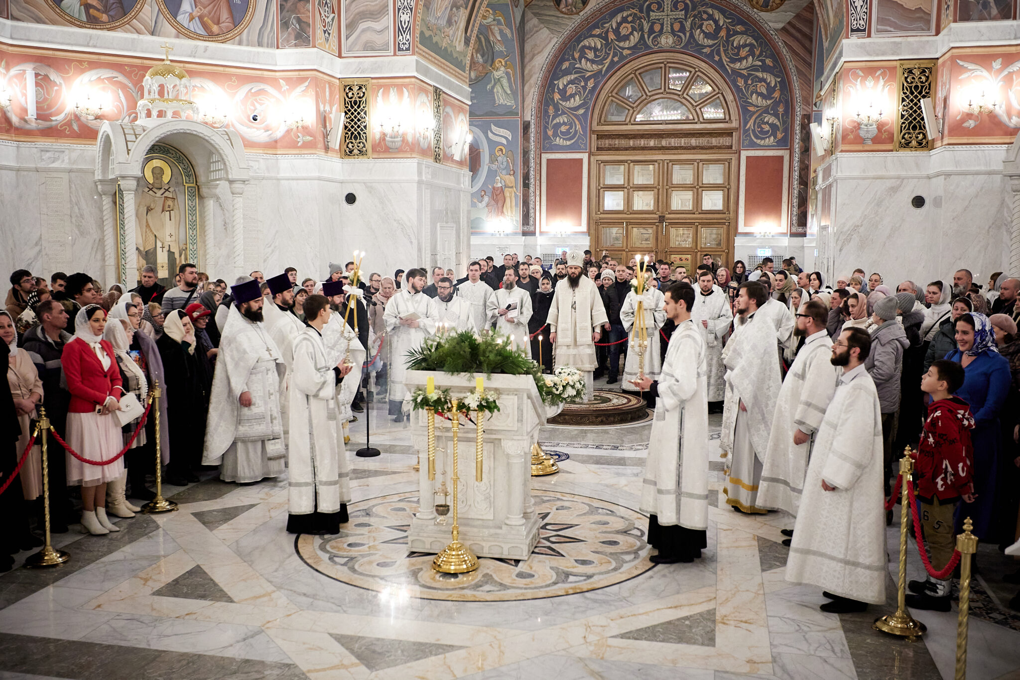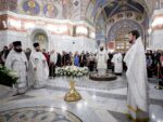 В эту праздничную ночь за богослужением многократно звучали тропарь: «Во Иордане крещающуся Тебе, Господи», кондак Крещения Господня: «Явился еси днесь вселенней», и величание: «Величаем Тя, Живодавче Христе, нас ради ныне плотию крестившагося от Иоанна в водах Иорданских».