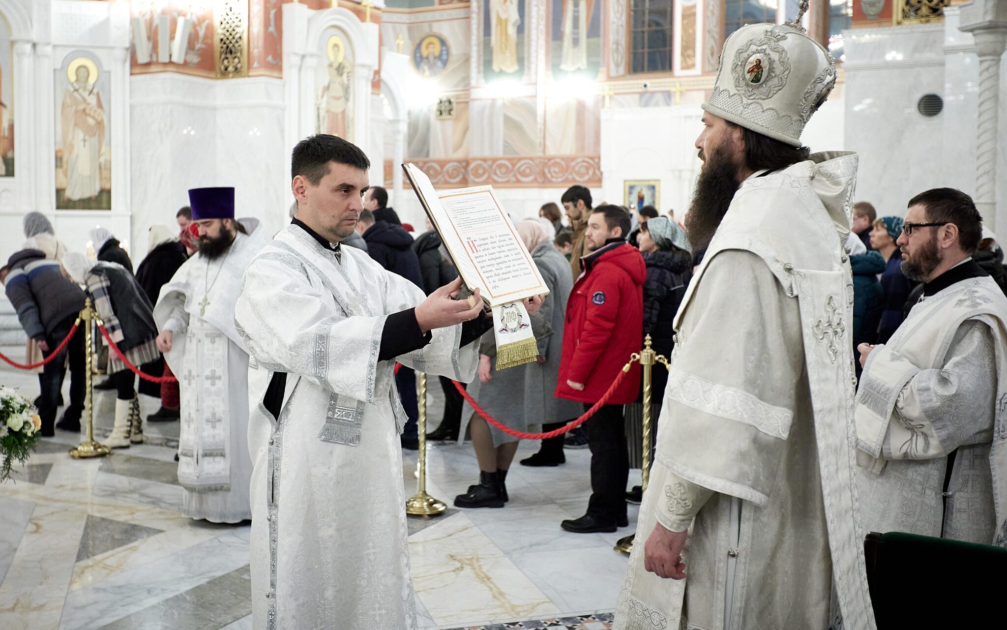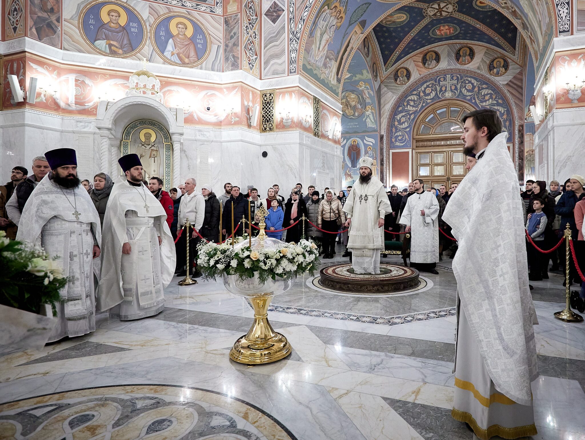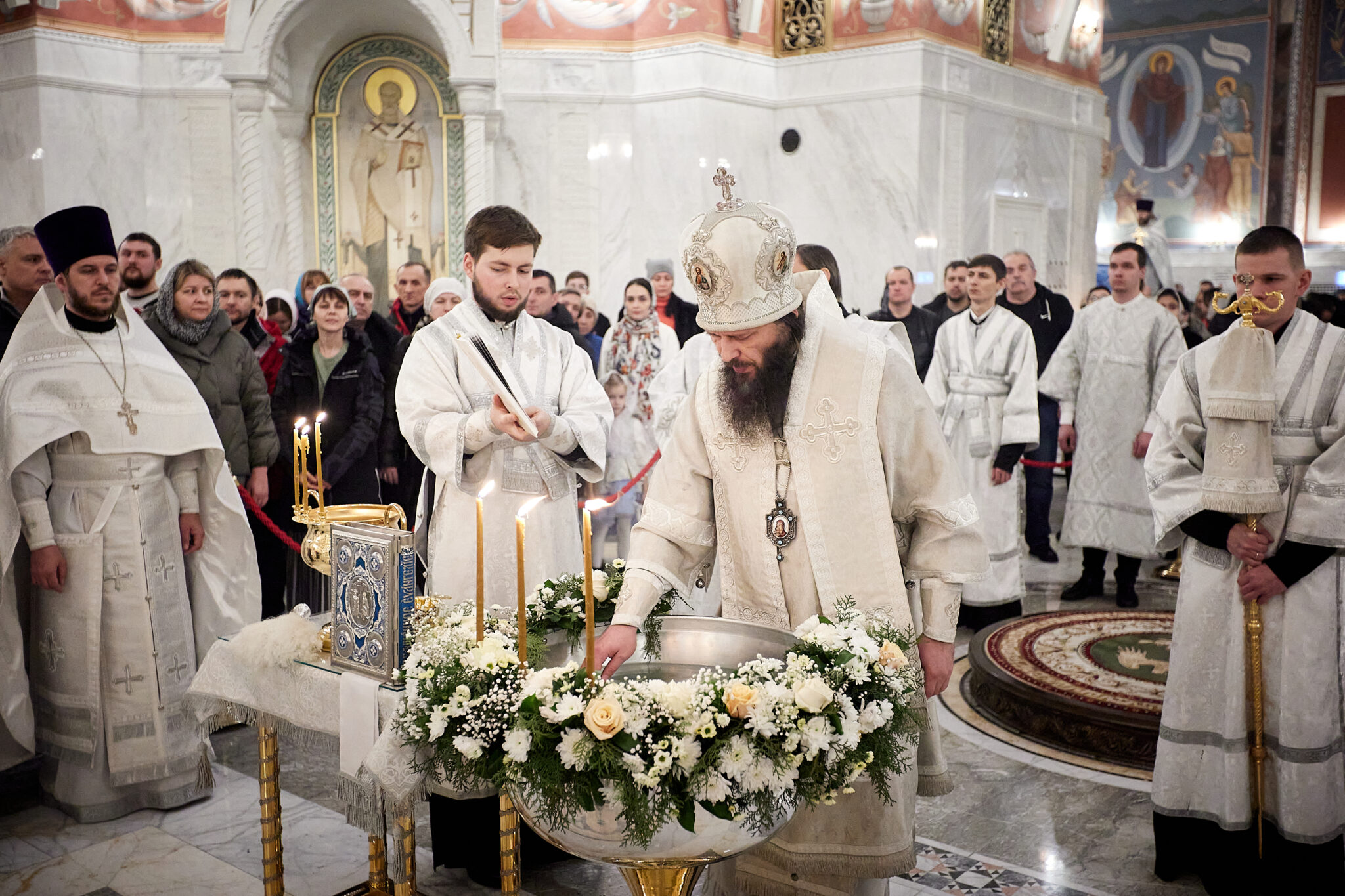 Под пение тропарей «Глас Господень на водах», «Днесь вод освящается естество» и «Яко Человек на реку пришел еси, Христе Царю» архипастырь совершил каждение приготовленной к освящению воды, священнослужителей, хор и молящихся.