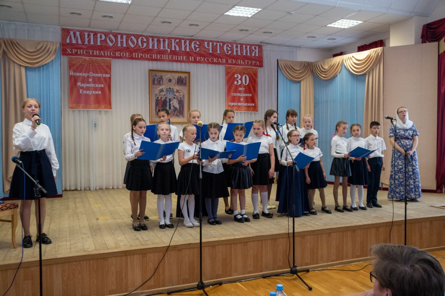 Далее конкурсанты представили патриотические песни. Выбор у ребят был разнообразен – волжане, к примеру, представили литературно-музыкальную композицию о героях Великой Отечественной войны, певчие «Благовеста» прославляли любимую Россию, а татьянинцы – свою малую родину Йошкар-Олу. Следующая номинация – песни на марийском языке…