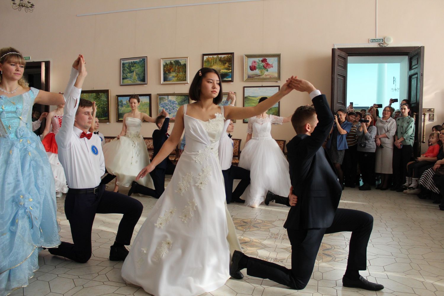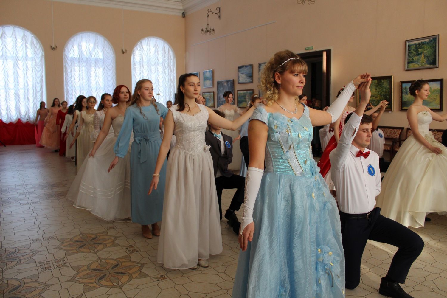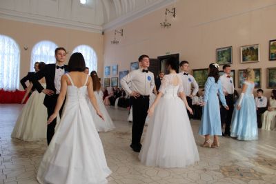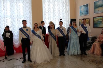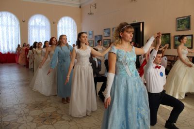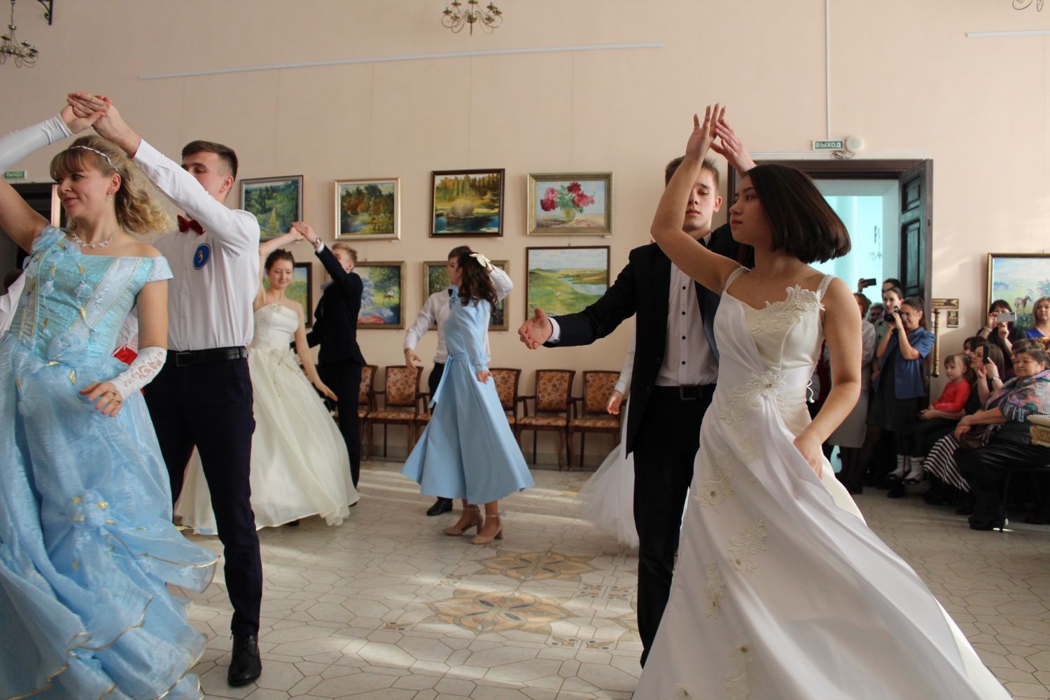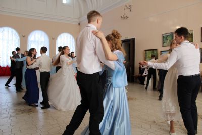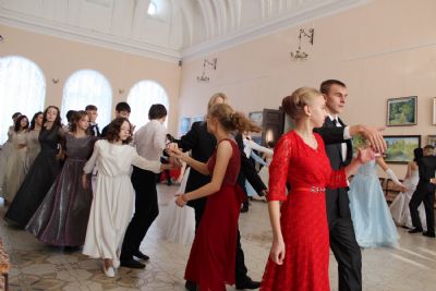 Первый танец – вальс исполняют сами ведущие. Далее участники бала показывают умение танцевать и соблюдать этикет. Жюри приятно удивлено. Это заслуга преподавателя танцев Валентины Германовны Рукомойниковой. Кроме того, участники в викторине показывают знание истории бала.