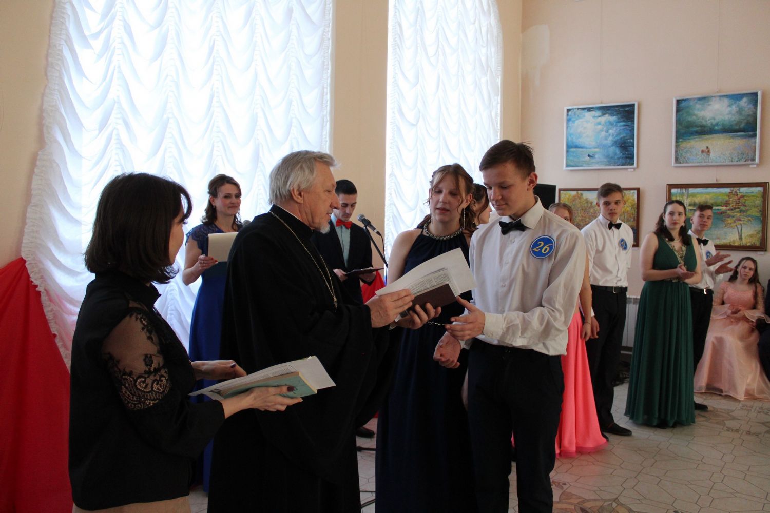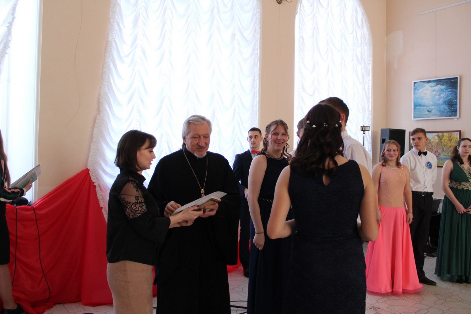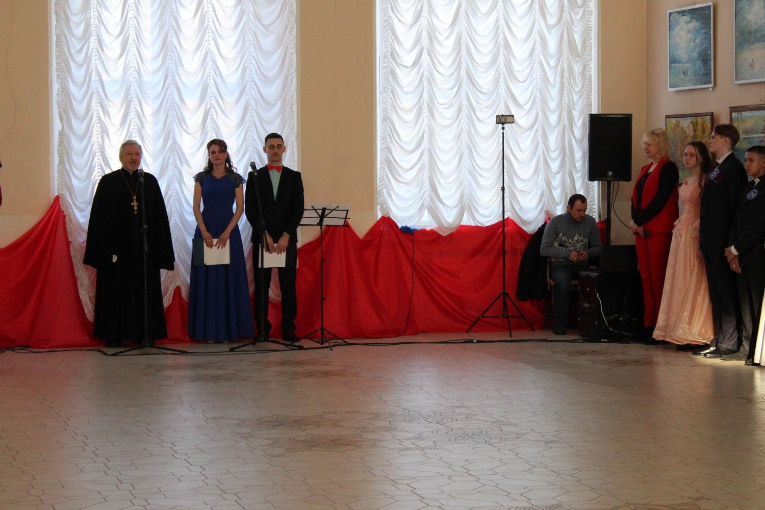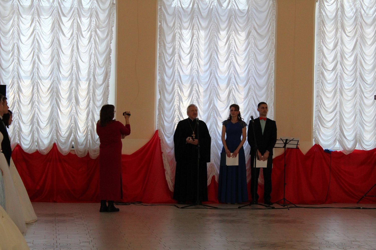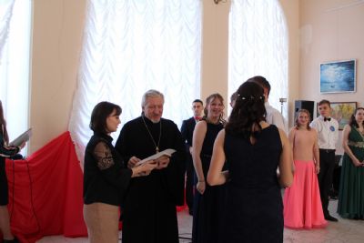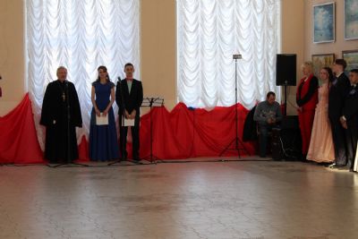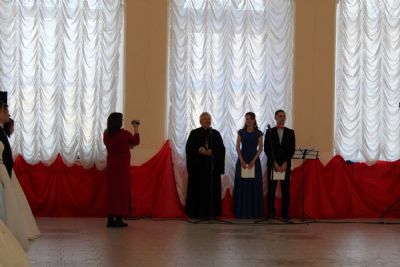 После полонеза ведущие предоставляют слово почетным гостям: Главе администрации района Марине Евгеньевне Шиховой – она поздравляет присутствующих с праздником Сретения Господня и Днем православной молодежи; настоятелю храма Архангела Михаила п. Юрино протоиерею Николаю Барсукову – отец Николай рассказывает о значении праздника Сретения Господня, поздравляет участников и гостей с праздником и зачитывает Патриаршее обращение к православной молодежи.