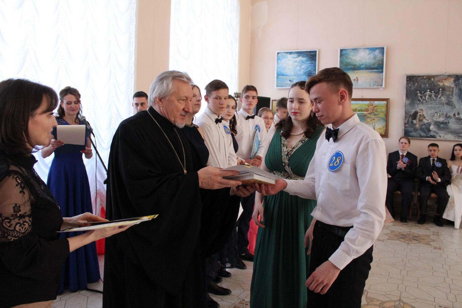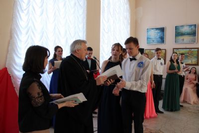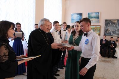Протоиерей Николай награждает каждого участника дипломом и вручает памятные подарки – православные книги. Далее следует награждение по номинациям.